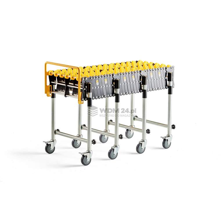 Przenośnik rolkowy posiada koła i można go łatwo zsunąć, co ułatwia transport i przechowywanie, gdy nie jest używany.
