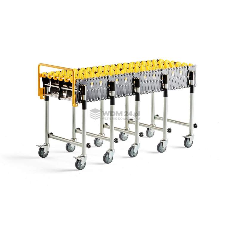 Przenośnik rolkowy posiada koła i można go łatwo zsunąć, co ułatwia transport i przechowywanie, gdy nie jest używany.