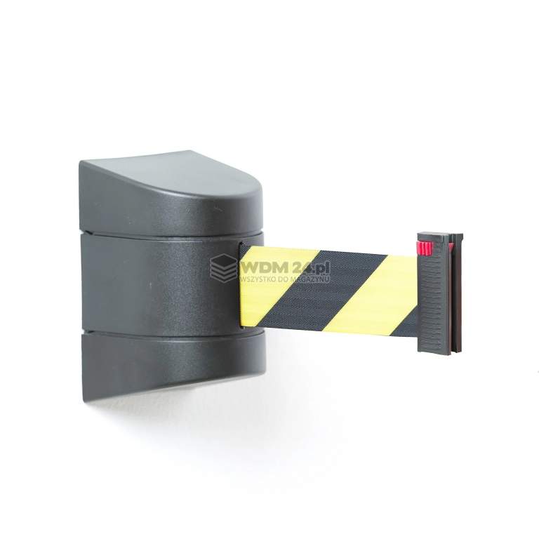 Uchwyt ścienny z taśmą z funkcją automatycznego powrotu. Uchwyt zawiera także uchwyt do zamocowania końca innej taśmy. Taśmę można także zamocować do słupka odgradzającego. Uchwyt z długą taśmą to doskonałe rozwiązanie do tworzenia stałych barier odgradzających. Użyj uchwytu do tworzenia barier i kierowania kolejkami oraz ruchem pieszych, klientów itp. Przykłady środowisk, gdzie sprawdzą się bariery to między innymi magazyny, warsztaty, kina, sklepy, lotniska itp.