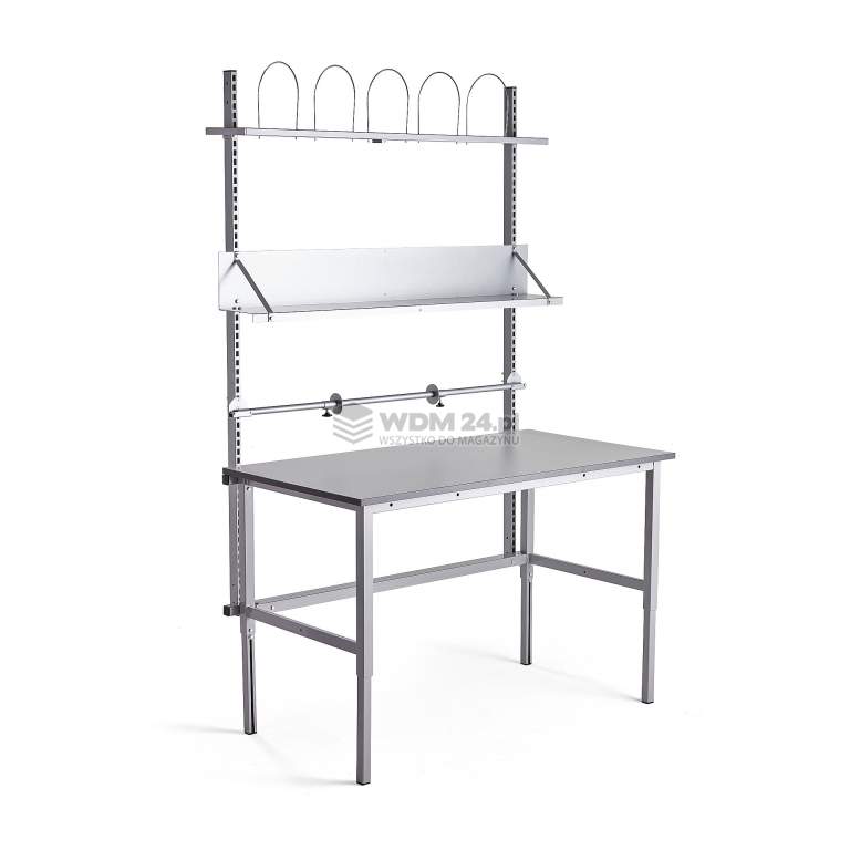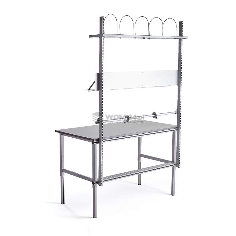 Praktyczny stół do pakowania z trwałym blatem i ręcznie regulowaną ramą zapewniającą ergonomiczne miejsce pracy. Stół jest dostarczany w komplecie z dodatkową ramą z półkami wyposażonymi w przegrody, pochyłą półką i uchwytem na rolkę z regulowanymi ogranicznikami. Stół do pakowania pomoże Ci stworzyć ergonomiczne stanowisko pracy!