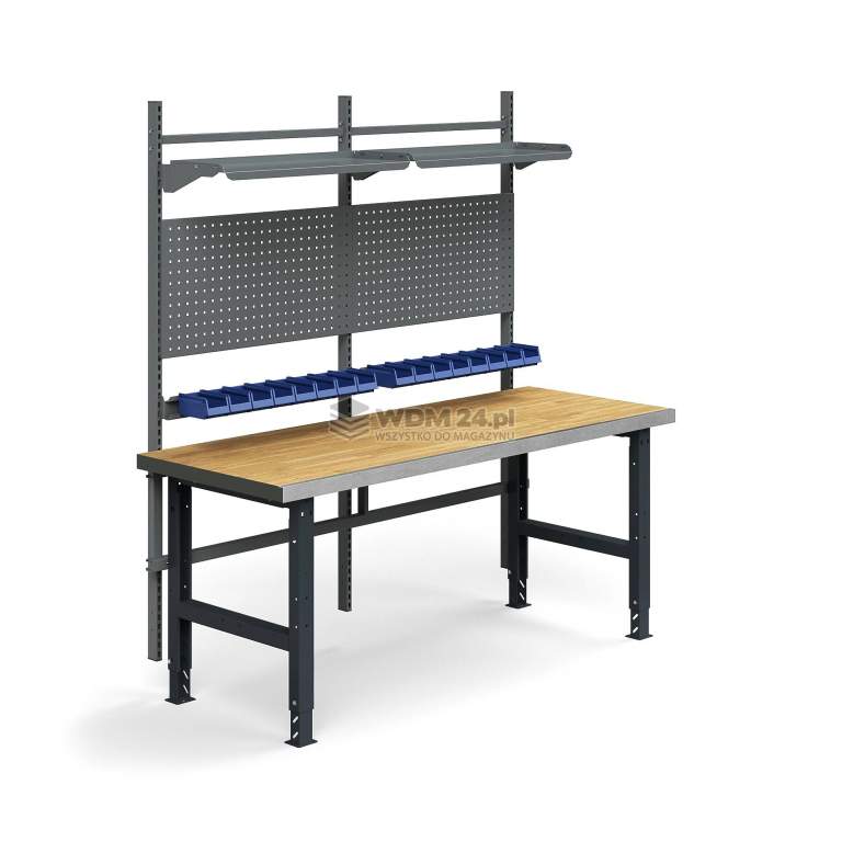 Szerokie, w pełni wyposażone stanowisko warsztatowe TRUST o wymiarach 2000x760 mm i udźwigu 600 kg. Zestaw obejmuje masywny blat z parkietu dębowego (50 mm) wzmocniony stalową krawędzią oraz regulację wysokości. Kompletna zabudowa nadblatowa (panele, pojemniki, półki) zapewnia idealną organizację pracy przy dużych projektach w najbardziej wymagających warsztatach.