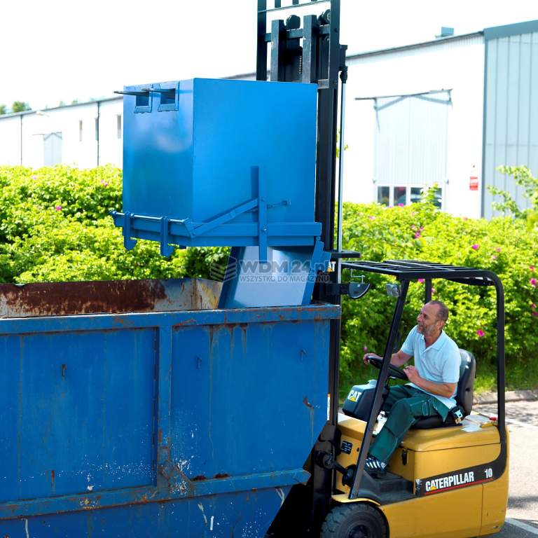 Po opróżnieniu, dno zamyka się samoczynnie. Kontener jest wyposażony w tunele na widły, co sprawia, że można go transportować przy pomocy wózka widłowego.