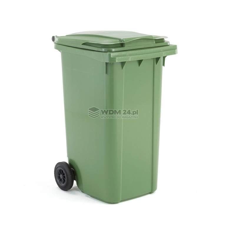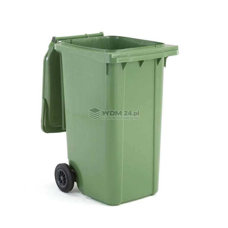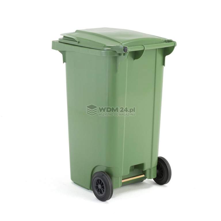 Kosz na śmieci zgodny z europejskim standardem DIN-EN840. Pojemnik posiada dwa koła i szeroki uchwyt. Trwały pojemnik na odpady wykonany z twardego HDPE.