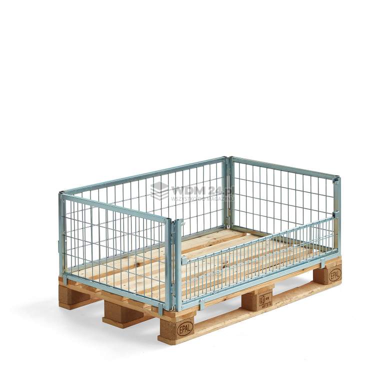 Trwały kosz paletowy EURO. Na jednym z dłuższych boków znajduje się furtka, która zapewnia łatwy dostęp do zawartości. Ułatwia załadunek i rozładunek towarów. Kosze można ustawiać w stos, nawet gdy paleta jest załadowana, jeśli używane są narożniki. Nasadzana rama paletowa to sprytne rozwiązanie do magazynów, warsztatów i innych środowisk, gdzie obsługiwane są towary przed wysyłką do klienta. Nasza rama nasadzana pasuje do palet EURO i jest łatwa w montażu. Rama jest składana i łatwo ją zamontować oraz zdjąć, gdy nie jest potrzebna.
