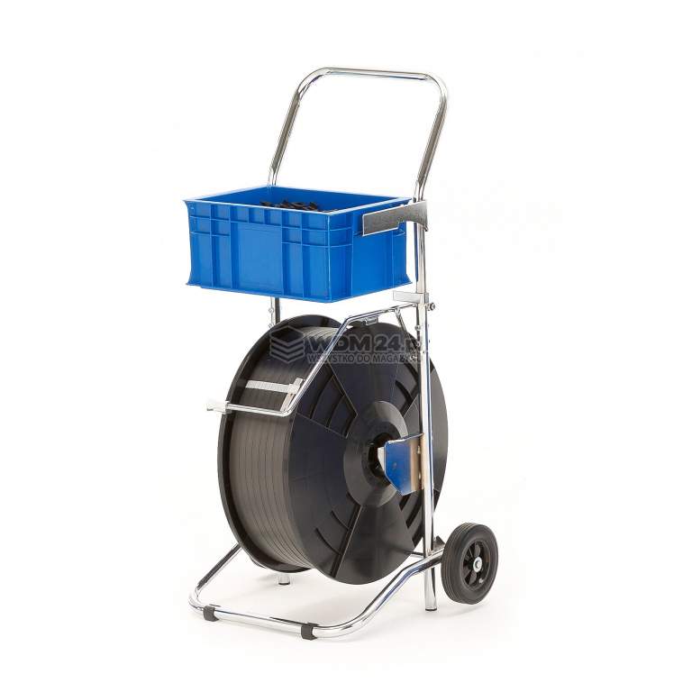 Odwijarka do taśmy PP. Wyposażona w plastikowy pojemnik, dwa koła i uchwyt do prowadzenia. Do taśm o średnicy wewnętrznej 200-280 mm. Mobilna odwijarka do taśm PP o średnicy wewnętrznej 200-280 mm. Przewleczenie przez oczko ułatwia znalezienie końca taśmy. Ramę wykonano z trwałych rur stalowych wykończonych chromem. Dzięki szerokiemu uchwytowi i mocnym kołom łatwo transportować odwijarkę z miejsca na miejsce. W pozycji pionowej koła są lekko uniesione nad podłożem, co zapobiega niekontrolowanemu odjeżdżaniu produktu. Nad stojakiem na taśmę znajduje się solidny pojemnik do przechowywania narzędzi, klamer itp.