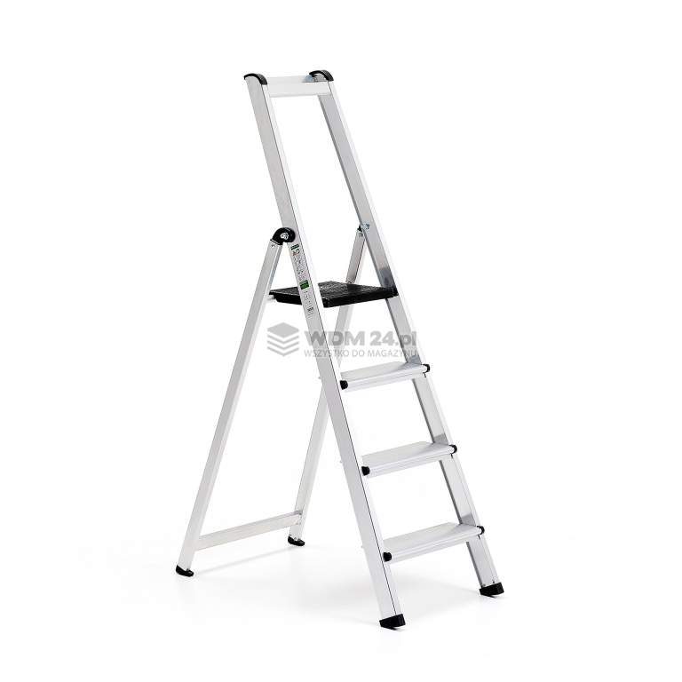 Drabina oferuje stabilną platformę i stopnie o głębokości 120 mm. Poręcz drabiny została wyposażona w sprytną półkę na narzędzia i inny sprzęt. Stopki są antypoślizgowe i chronią podłogę.