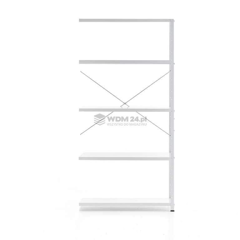Moduł dodatkowy dostarczany jest z pięcioma półkami. Łatwa regulacja wysokości półek w odstępach co 40 mm dla większej funkcjonalności. Podobnie jak moduł podstawowy, moduł dodatkowy jest wykonany z blachy stalowej i oferuje wzmocnioną konstrukcję ze stężeniem krzyżowym i jedną ramą końcową po stronie wolnostojącej. Regał jest wyposażony również w stopki, które zapobiegają zarysowaniu podłogi.