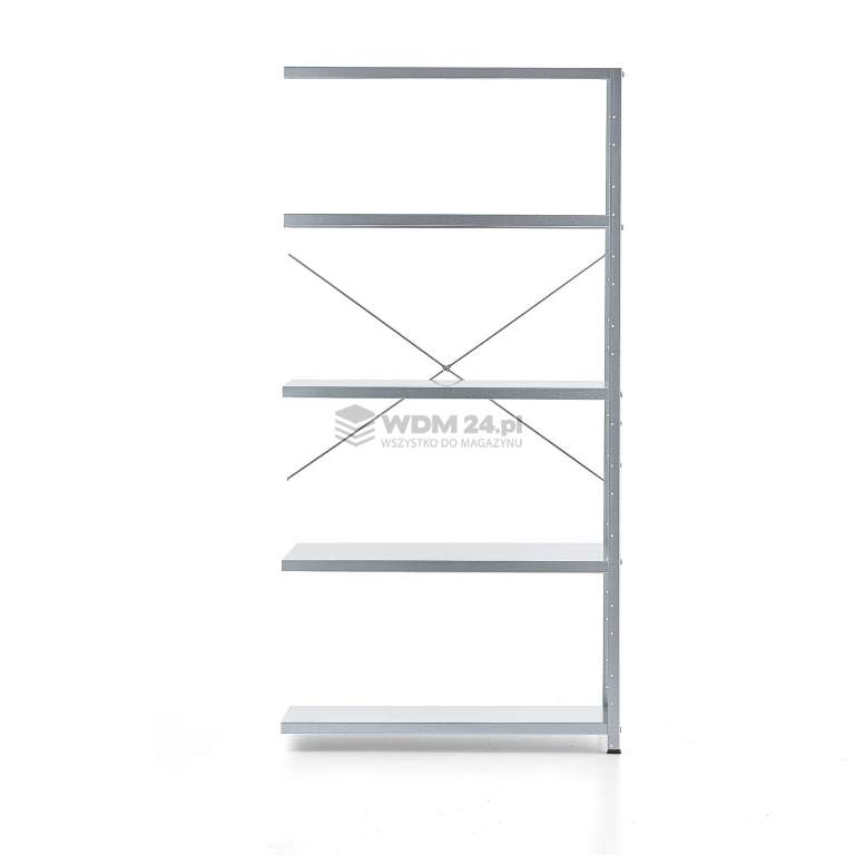 Moduł dodatkowy dostarczany jest z pięcioma półkami. Łatwa regulacja wysokości półek w odstępach co 40 mm dla większej funkcjonalności. Podobnie jak moduł podstawowy, moduł dodatkowy jest wykonany z blachy stalowej i oferuje wzmocnioną konstrukcję ze stężeniem krzyżowym i jedną ramą końcową po stronie wolnostojącej. Regał jest wyposażony również w stopki, które zapobiegają zarysowaniu podłogi.