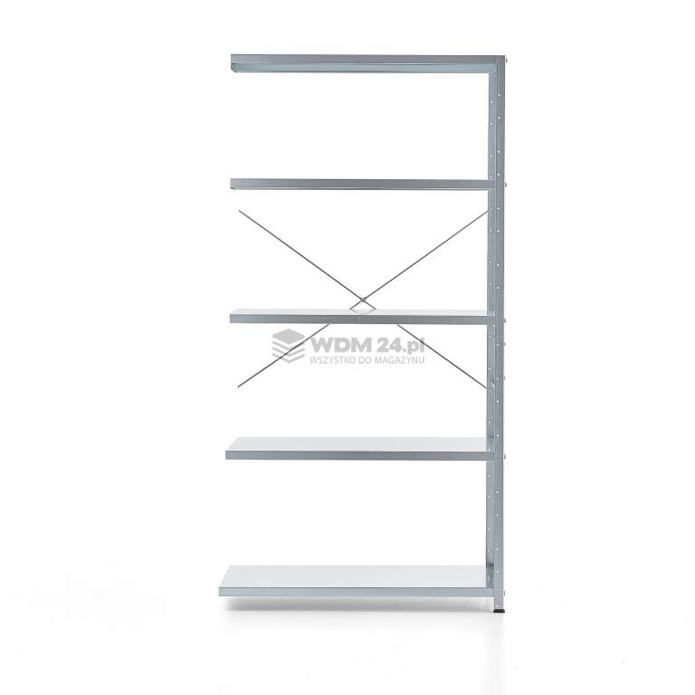 Moduł dodatkowy dostarczany jest z pięcioma półkami. Łatwa regulacja wysokości półek w odstępach co 40 mm dla większej funkcjonalności. Podobnie jak moduł podstawowy, moduł dodatkowy jest wykonany z blachy stalowej i oferuje wzmocnioną konstrukcję ze stężeniem krzyżowym i jedną ramą końcową po stronie wolnostojącej. Regał jest wyposażony również w stopki, które zapobiegają zarysowaniu podłogi.