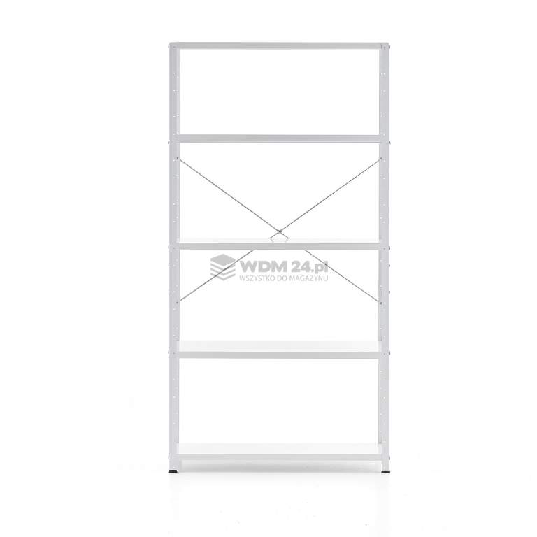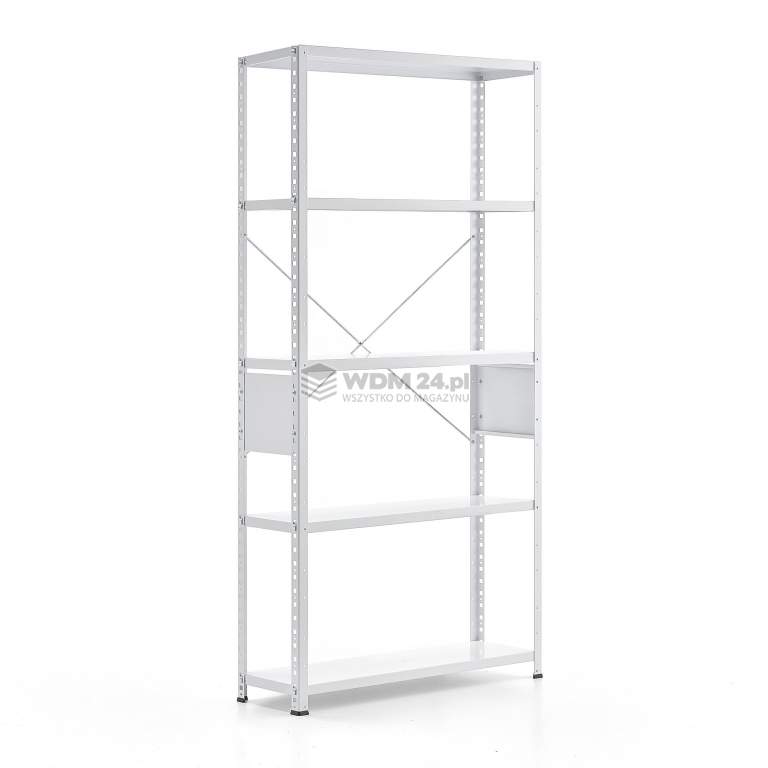 Prezentowany regał dostarczany jest z pięcioma półkami. Łatwa regulacja wysokości półek w odstępach co 40 mm dla większej funkcjonalności. Stężenie krzyżowe tylne i ramy boczne wzmacniają solidną konstrukcję regału i zapewniają dodatkową stabilność. Regał jest wyposażony również w stopki, które zapobiegają zarysowaniu podłogi.