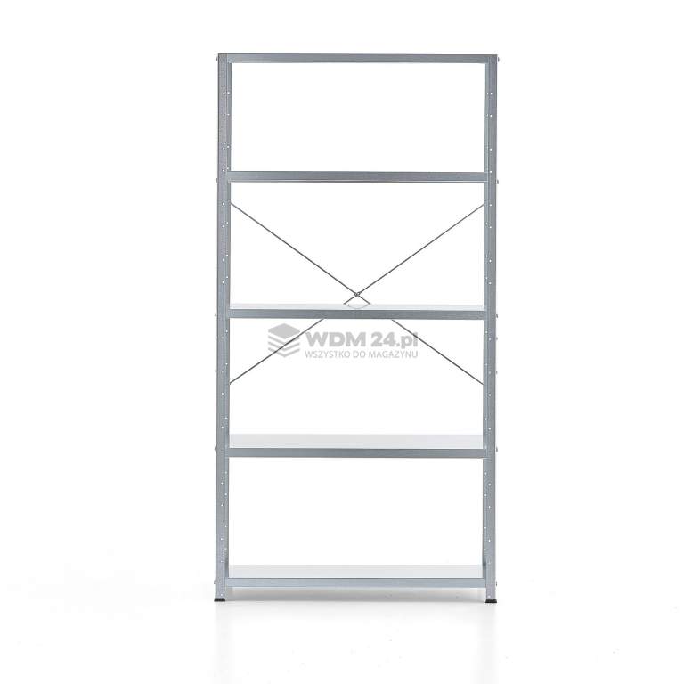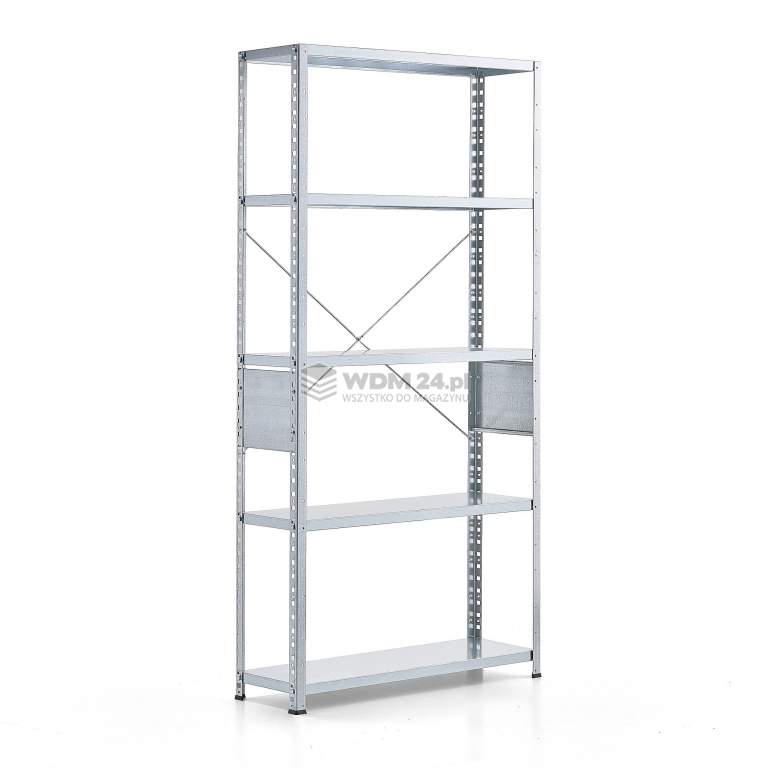 Prezentowany regał dostarczany jest z pięcioma półkami. Łatwa regulacja wysokości półek w odstępach co 40 mm dla większej funkcjonalności. Stężenie krzyżowe tylne i rama końcowa wzmacniają solidną konstrukcję regału i zapewniają dodatkową stabilność. Regał jest wyposażony również w stopki, które zapobiegają zarysowaniu podłogi.