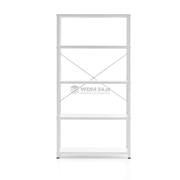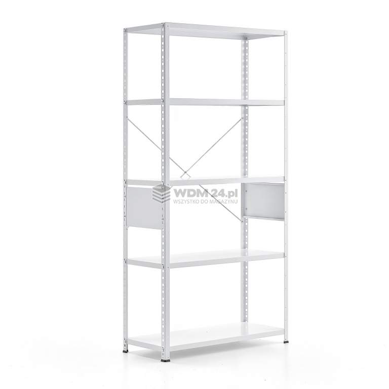 Prezentowany regał dostarczany jest z pięcioma półkami. Łatwa regulacja wysokości półek w odstępach co 40 mm dla większej funkcjonalności. Stężenie krzyżowe tylne i ramy boczne wzmacniają solidną konstrukcję regału i zapewniają dodatkową stabilność. Regał jest wyposażony również w stopki, które zapobiegają zarysowaniu podłogi.