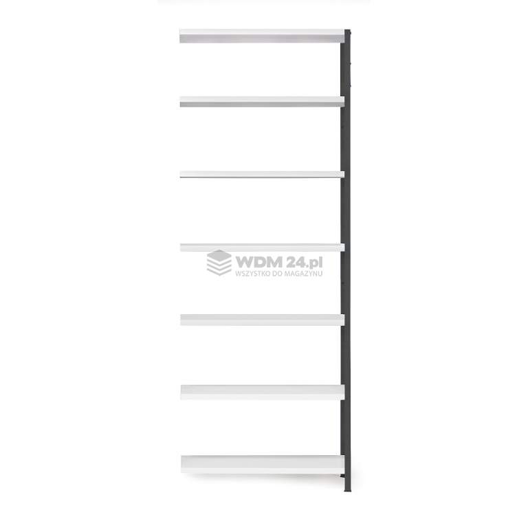 Moduł dodatkowy regału IDEAL. Wyposażony w siedem regulowanych półek z szynami wzmacniającymi, stężenie krzyżowe tylne i stężenie boczne. Moduł dodatkowy, który umożliwia rozbudowę modułu podstawowego regału IDEAL i stworzenie systemu na miarę potrzeb. Moduł dodatkowy jest dostarczany z ramą, na której należy zahaczyć półki. Z drugiej strony półki należy zamocować do ramy modułu podstawowego. Dodaj jeden lub kilka modułów dodatkowych - jedyne ograniczenie to wielkość pomieszczenia! Moduł dodatkowy wykonano z blachy stalowej. Wyposażony w stężenie tylne i boczne. Łatwa regulacja wysokości półek w odstępach co 40 mm dla większej funkcjonalności. Maksymalne obciążenie każdej półki wynosi 150 kg przy równomiernym rozmieszczeniu ładunku. Półki wyposażone w trwałe szyny wzmacniające. Dokup dodatkowe półki dla optymalnego rozwiązania (sprzedawane oddzielnie).