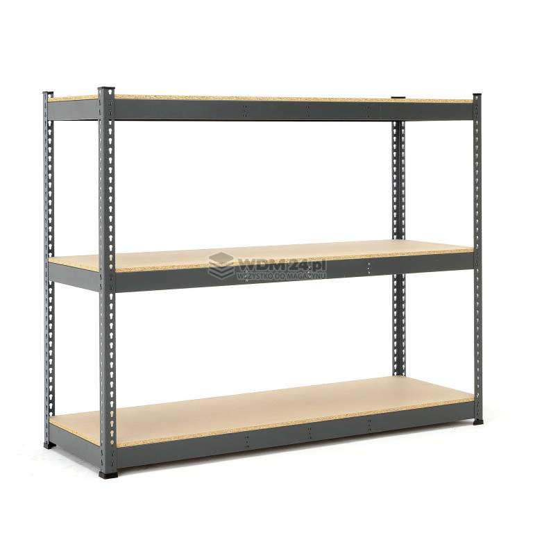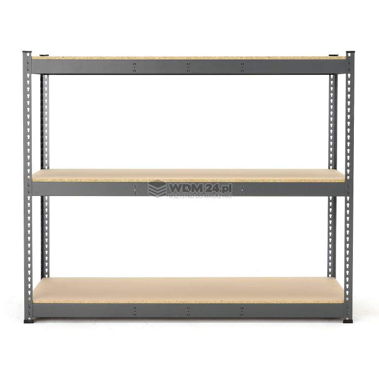 Półki wyprodukowano z mocnych belek i płyty wiórowej o grubości 16 mm. Każda półka wytrzymuje maksymalne równomierne obciążenie 700 kg. Belki oraz słupki wykonano z blachy stalowej lakierowanej proszkowo na kolor ciemnoszary. Wykończenie lakierem proszkowym zapewnia optymalną wytrzymałość i odporność na uderzenia. Regał jest łatwy w montażu i nie wymaga użycia śrub ani stężeń tylnych i bocznych.