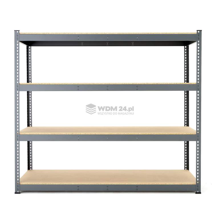 Półki wyprodukowano z mocnych belek i płyty wiórowej o grubości 16 mm. Każda półka wytrzymuje maksymalne równomierne obciążenie 500 kg. Belki oraz słupki wykonano z blachy stalowej lakierowanej proszkowo na kolor ciemnoszary. Wykończenie lakierem proszkowym zapewnia optymalną wytrzymałość i odporność na uderzenia. Regał jest łatwy w montażu i nie wymaga użycia śrub ani stężeń tylnych i bocznych.