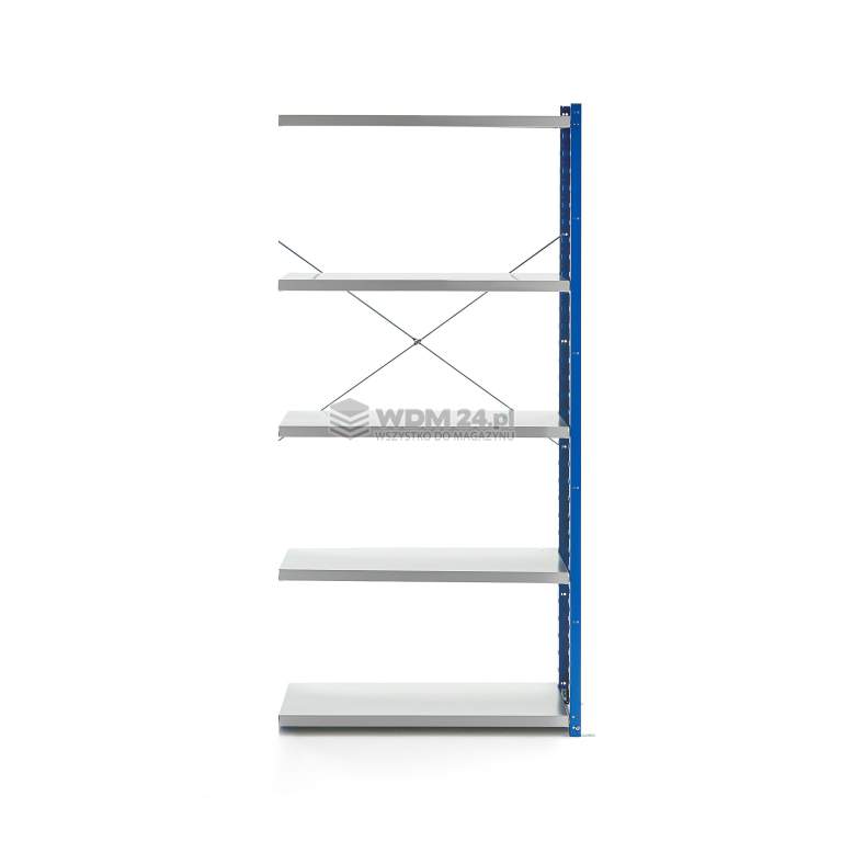 Każdy moduł dodatkowy posiada jedną ramę oraz komplet półek. Moduł dodatkowy łatwo połączyć z modułem podstawowym. Wystarczy zahaczyć półki modułu dodatkowego na ramie sąsiadującego regału.