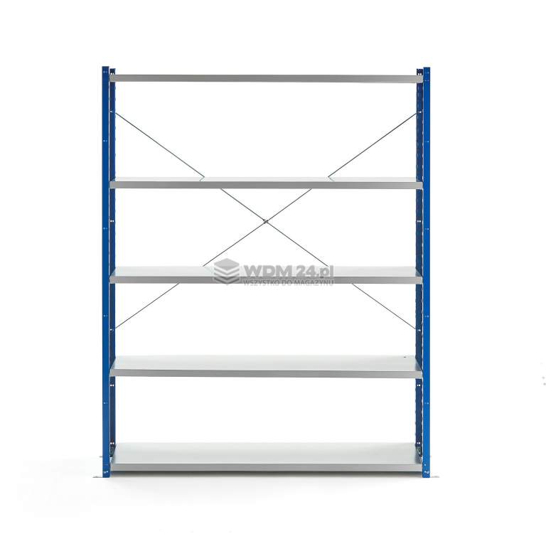 Maksymalne obciążenie każdej półki wynosi 150 kg przy równomiernym rozmieszczeniu ładunku. Moduł podstawowy dostarczamy ze stężeniem tylnym oraz ścianami bocznymi dla dodatkowej stabilności. Słupki boczne wyposażone są w stopki, które pozwalają zakotwić regał w podłodze.