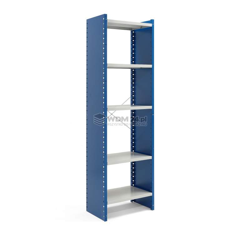 Moduły podstawowe wykonano z blachy stalowej lakierowanej proszkowo. Wykończenie lakierem proszkowym zapewnia trwałość oraz odporność na zarysowania i intensywne użytkowanie w trudnych środowiskach. Półki można zamontować zgodnie z wymaganiami i przestawiać w górę lub w dół w odstępach co 50 mm. Do montażu nie potrzeba narzędzi - wystarczy zahaczyć półki na wybranej wysokości. Maksymalne obciążenie każdej półki wynosi 150 kg przy równomiernym rozmieszczeniu ładunku. Moduł podstawowy dostarczamy ze stężeniem tylnym oraz stężeniami bocznymi dla dodatkowej stabilności. Słupki boczne wyposażone są w stopki, które pozwalają zakotwić regał w podłodze.