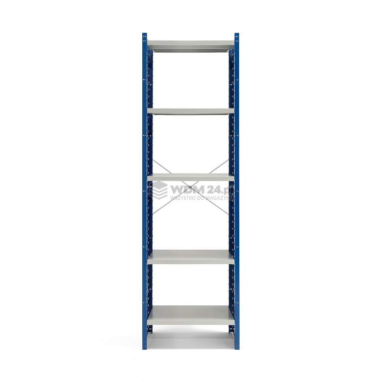 Moduły podstawowe wykonano z blachy stalowej lakierowanej proszkowo. Wykończenie lakierem proszkowym zapewnia trwałość oraz odporność na zarysowania i intensywne użytkowanie w trudnych środowiskach. Półki można zamontować zgodnie z wymaganiami i przestawiać w górę lub w dół w odstępach co 50 mm. Do montażu nie potrzeba narzędzi - wystarczy zahaczyć półki na wybranej wysokości. Maksymalne obciążenie każdej półki wynosi 150 kg przy równomiernym rozmieszczeniu ładunku. Moduł podstawowy dostarczamy ze stężeniem tylnym oraz stężeniami bocznymi dla dodatkowej stabilności. Słupki boczne wyposażone są w stopki, które pozwalają zakotwić regał w podłodze.