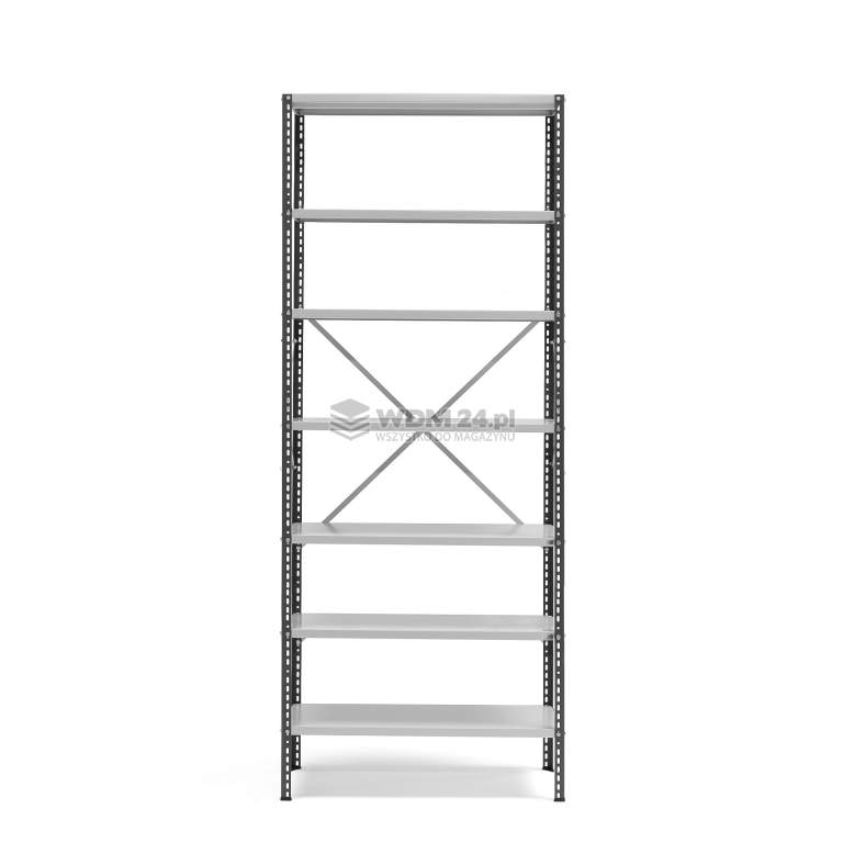 Regał z 2 stężeniami bocznymi i stężeniem tylnym dla dodatkowej stabilności. Wyposażony w regulowane półki ze spawanymi szynami wzmacniającymi. Nasz stabilny regał wykonano z blachy stalowej lakierowanej proszkowo. Wykończenie lakierem proszkowym zapewnia optymalną wytrzymałość i odporność na uderzenia. Doskonały w szczególności do magazynów. Sprawdzi się także w biurach itp. Półki wyposażono w spawane szyny wzmacniające, dzięki którym każda półka wytrzymuje maksymalne obciążenie 170 kg. Montaż regału wymaga śrub. Półki można montować na dowolnej wysokości oraz przestawiać w górę i w dół zgodnie z potrzebą. Słupki wyposażono w plastikowe stopki, które chronią podłogę przed uszkodzeniami. System regałów można łatwo rozbudować w poziomie przy pomocy dowolnej liczy modułów dodatkowych (sprzedawane oddzielnie, patrz akcesoria).