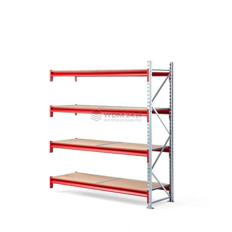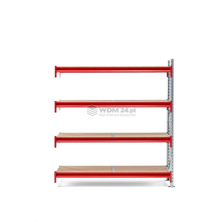 Ramy i belki nośne wykonano ze stali lakierowanej proszkowo, co zapewnia trwałe wykończenie. Moduł dodatkowy jest łatwy w montażu - wystarczy zahaczyć belki nośne na ramie i połączyć z modułem podstawowym. Belki można montować na dowolnej wysokości. Następnie należy ułożyć półki na belkach. W zestawie stopy do zakotwienia regału w podłożu. Prezentowany moduł należy połączyć z co najmniej jednym modułem podstawowym.