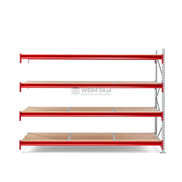 Ramy i belki nośne wykonano ze stali lakierowanej proszkowo, co zapewnia trwałe wykończenie. Moduł dodatkowy jest łatwy w montażu - wystarczy zahaczyć belki nośne na ramie i połączyć z modułem podstawowym. Belki można montować na dowolnej wysokości. Następnie należy ułożyć półki na belkach. W zestawie stopy do zakotwienia regału w podłożu. Prezentowany moduł należy połączyć z co najmniej jednym modułem podstawowym.