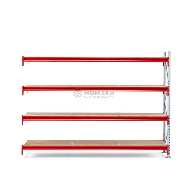 Ramy i belki nośne wykonano ze stali lakierowanej proszkowo, co zapewnia trwałe wykończenie. Moduł dodatkowy jest łatwy w montażu - wystarczy zahaczyć belki nośne na ramie i połączyć z modułem podstawowym. Belki można montować na dowolnej wysokości. Następnie należy ułożyć półki na belkach. W zestawie stopy do zakotwienia regału w podłożu. Prezentowany moduł należy połączyć z co najmniej jednym modułem podstawowym.