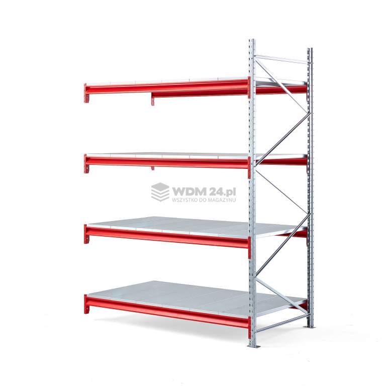 Ramy i belki nośne wykonano ze stali lakierowanej proszkowo, co zapewnia trwałe wykończenie. Moduł dodatkowy jest łatwy w montażu - wystarczy zahaczyć belki nośne na ramie i połączyć z modułem podstawowym. Belki można montować na dowolnej wysokości. Następnie należy ułożyć półki na belkach. W zestawie stopy do zakotwienia regału w podłożu. Prezentowany moduł należy połączyć z co najmniej jednym modułem podstawowym.
