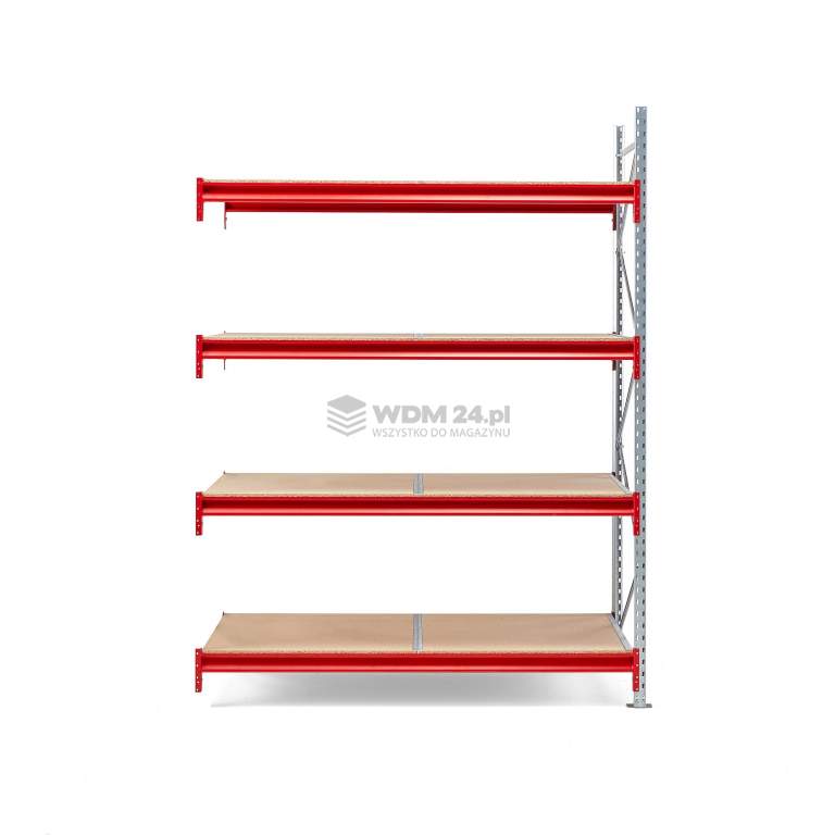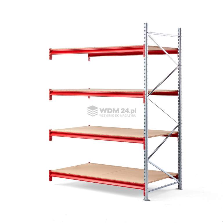 Prezentowany moduł dodatkowy posiada jedną ramę oraz cztery półki i osiem belek nośnych. Każda półka jest podzielona na sekcje dla ułatwienia montażu: półki o szerokości 1800 mm - 2 sekcje z płyty na parę belek nośnych.