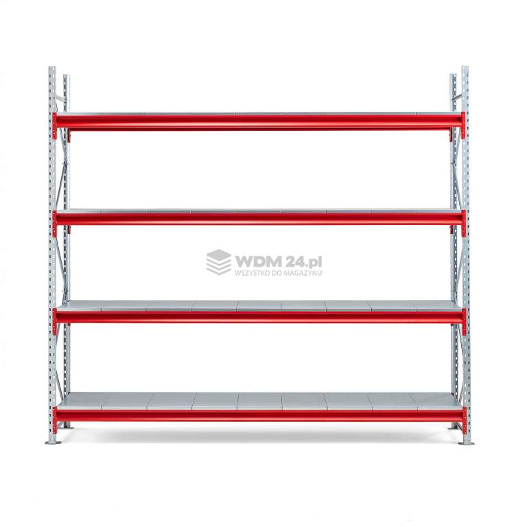 Ramy i belki nośne wykonano ze stali lakierowanej proszkowo, co zapewnia trwałe wykończenie. Moduł podstawowy jest łatwy w montażu. Wystarczy zahaczyć belki nośne na dowolnej wysokości perforowanych słupków ramy i ułożyć półki na belkach. W zestawie stopy do zakotwienia regału w podłożu.