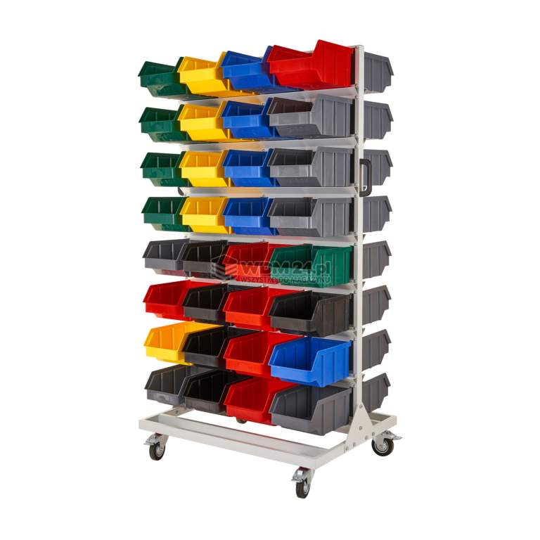Regał warsztatowy/garażowy z pojemnikami 64 szt. - jezdny, dwustronny