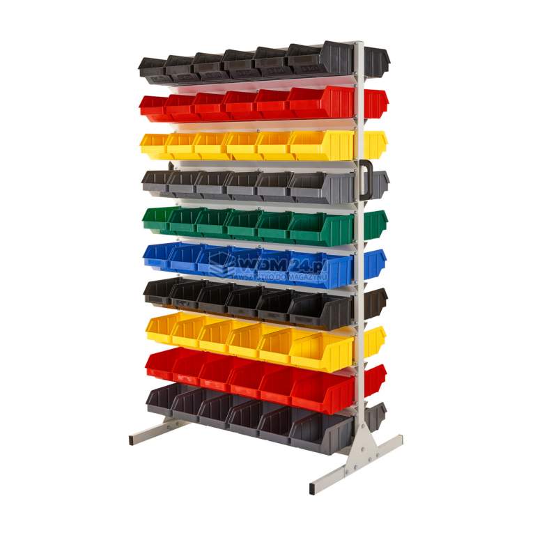 Regał z pojemnikami plastikowymi (kuwety) w komplecie. Znakomicie nadaje się do profesjonalnego lub domowego warsztatu/garażu. Dzięki regałowi użytkownik zorganizuje przechowywanie drobnych przedmiotów takich jak śruby, wkręty, nakrętki itp. Znajdzie także zastosowanie w serwisie RTV/AGD, gdzie pozwoli zoptymalizować przechowywanie serwisowych części zamiennych na stanowisku pracy montera lub serwisanta.