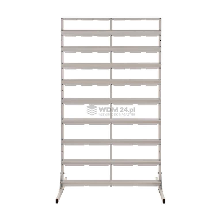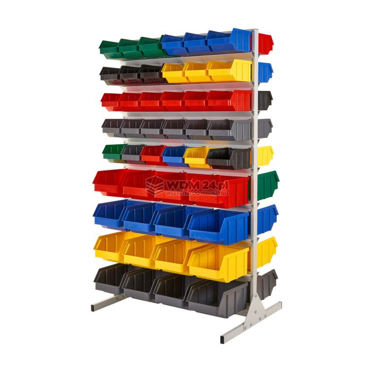 Regał z pojemnikami plastikowymi (kuwety) w komplecie. Znakomicie nadaje się do profesjonalnego lub domowego warsztatu/garażu. Dzięki regałowi użytkownik zorganizuje przechowywanie drobnych przedmiotów takich jak śruby, wkręty, nakrętki itp. Znajdzie także zastosowanie w serwisie RTV/AGD, gdzie pozwoli zoptymalizować przechowywanie serwisowych części zamiennych na stanowisku pracy montera lub serwisanta.