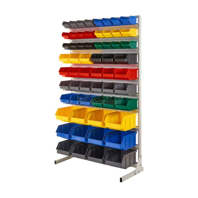 Regał z pojemnikami plastikowymi (kuwety) w komplecie. Znakomicie nadaje się do profesjonalnego lub domowego warsztatu/garażu. Dzięki regałowi użytkownik zorganizuje przechowywanie drobnych przedmiotów takich jak śruby, wkręty, nakrętki itp. Znajdzie także zastosowanie w serwisie RTV/AGD, gdzie pozwoli zoptymalizować przechowywanie serwisowych części zamiennych na stanowisku pracy montera lub serwisanta.