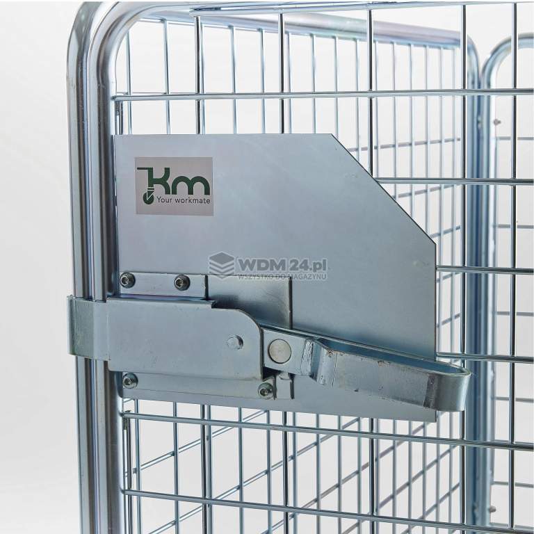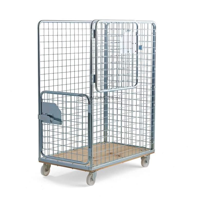 Rollkontener z drewnianą podstawą i dwiema furtkami na krótszym boku. Półki są sprzedawane oddzielnie, patrz akcesoria. Stabilny i łatwy w manewrowaniu rollkontener do transportu paczek, pudeł i innych towarów wielkogabarytowych. Z drewna i stali galwanizowanej elektrolitycznie. Posiada boki z drobnej siateczki o oczkach 65x65 mm. Dwie furtki na któtszym boku zamocowano na wysokości ułatwiającej załadunek i rozładunek. Dodaj jedną lub więcej półek z płyty MDF (sprzedawane osobno, patrz akcesoria). Półki można łatwo zawiesić na dowolnej wysokości.