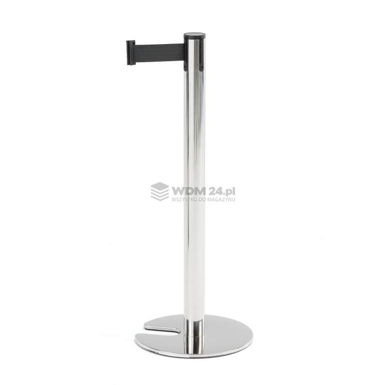 Słupek odgradzający do użytku wewnętrznego z 2 m taśmy, którą można wysunąć na żądaną długość i przymocować do kolejnego słupka lub uchwytu ściennego.