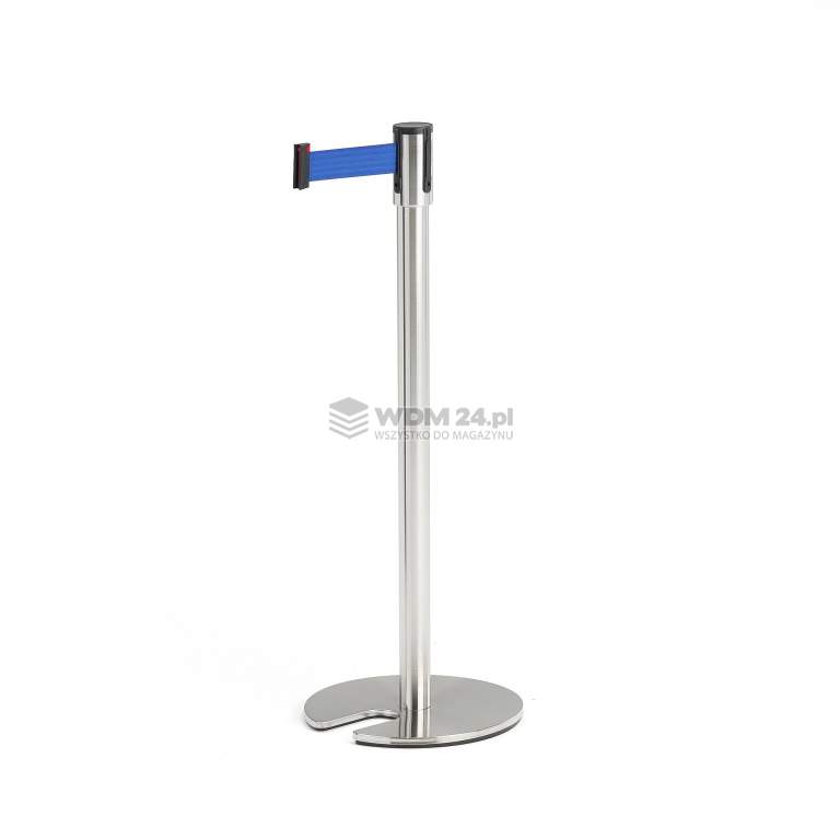 Słupek odgradzający do użytku wewnętrznego z 2 m taśmy, którą można wysunąć na żądaną długość i przymocować do kolejnego słupka lub uchwytu ściennego.
