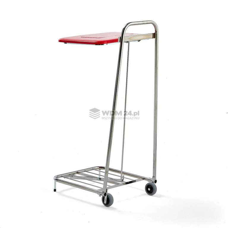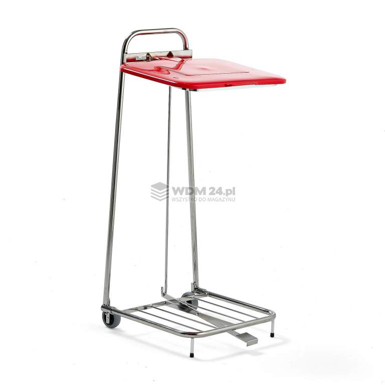 Stojak na worki na śmieci z przyciskiem nożnym, uchwytem, pokrywą oraz dwoma kołami stałymi. Worki na śmieci są sprzedawane oddzielnie. Stojak na worek z chromowaną ramą z rur stalowych. Doskonały do szpitali, firm produkujących żywność oraz pomieszczeń sterylnych. Rama została wyposażona w wytrzymały uchwyt.