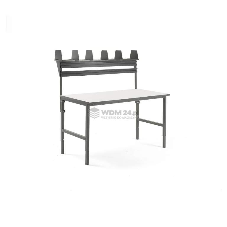 Stół do pakowania CARGO 1600x750 mm z nadstawką i 2 szynami na pojemniki. Odporny na zarysowania blat HPL, udźwig 400 kg i regulowana wysokość. Perfekcyjna organizacja drobnych części i akcesoriów e-commerce.