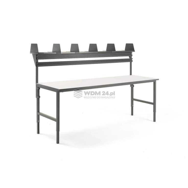 Stół pakowy CARGO 2400x750 mm z nadstawką i 2 długimi szynami na pojemniki. Maksymalna organizacja drobnych części i akcesoriów e-commerce. Odporny blat HPL, udźwig 400 kg i regulowana wysokość.