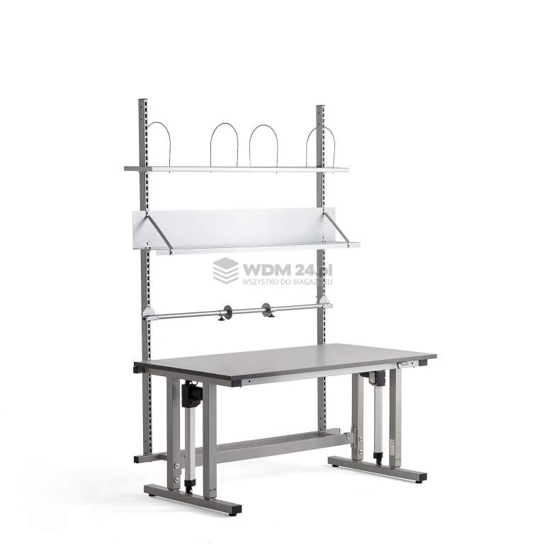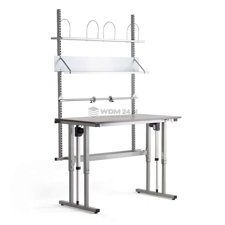 Stół do pakowania z elektryczną regulacją wysokości. Dostarczany z nadstawką zawierającą półkę z przegrodami, pochyłą półkę i regulowany dyspenser na tekturę falistą. Stwórz ergonomiczne stanowisko pracy dzięki stołowi z elektryczną regulacją wysokości.
