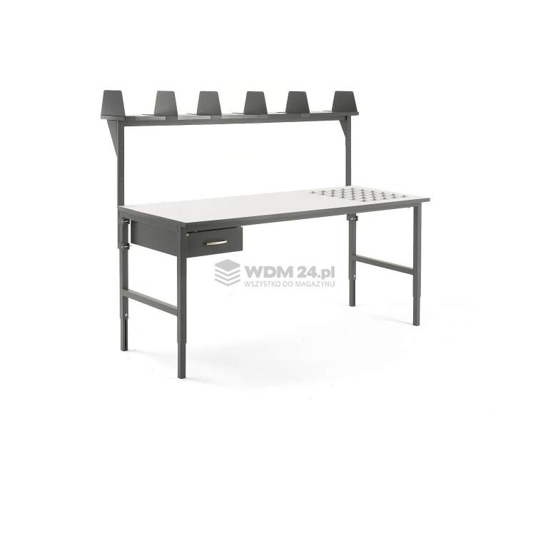 Blat roboczy (biały), półka oraz szuflada (szare) zostały pokryte laminatem wysokociśnieniowym (HPL). To materiał o ekstremalnej twardości, odporny na zarysowania, wilgoć i uderzenia. Solidna stalowa rama (lakierowana na kolor NCS S7502-B) gwarantuje stabilność przy obciążeniu do 400 kg. Dzięki ręcznej regulacji wysokości w zakresie 720-900 mm, stół można idealnie dopasować do wzrostu operatora.