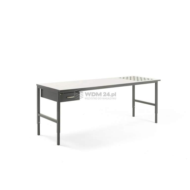 Konstrukcja spoczywa na stalowej, lakierowanej proszkowo ramie (kolor ciemnoszary NCS S7502-B) o nośności do 400 kg. Rama posiada funkcję ręcznej regulacji wysokości w zakresie 720-900 mm, co pozwala na ergonomiczne dopasowanie stanowiska do wzrostu pracownika i charakteru wykonywanych zadań.