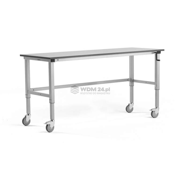 Stół z regulacją wysokości MOTION 2000x600 mm. Regulacja na korbę, udźwig 150 kg i pełna mobilność. Odporny blat HPL jasnoszary – profesjonalne, przestronne i ergonomiczne stanowisko pracy na kołach.