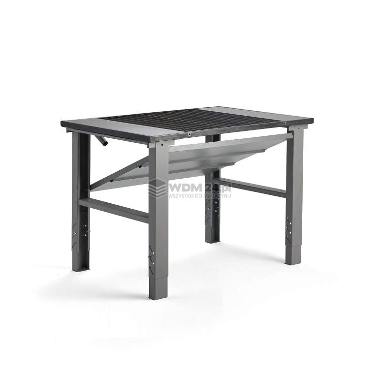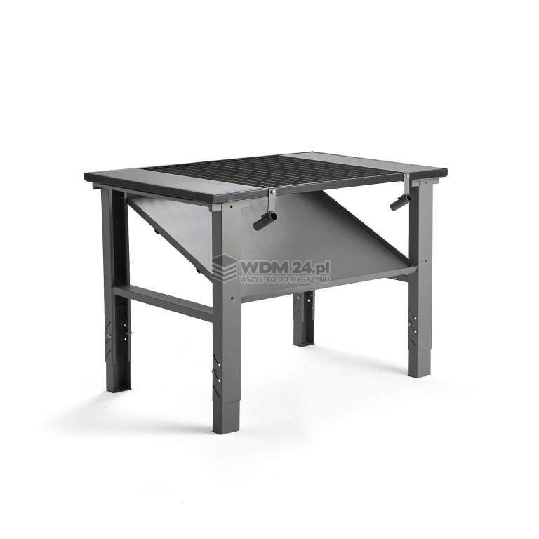 Stół spawalniczy SMITH 1200x800 mm z udźwigiem 500 kg. Posiada przesuwny blat z płaskowników, półkę na iskry i uchwyt na palnik. Regulowana wysokość (750-1020 mm) zapewnia pełną ergonomię pracy ślusarskiej.