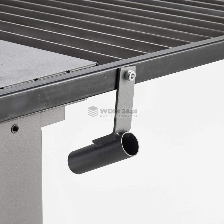 Pod ażurowym blatem zamontowana została pełna blaszana półka dolna. Jej zadaniem jest zbieranie iskier, odprysków oraz odpadów spawalniczych, co chroni podłogę warsztatu i ułatwia sprzątanie po zakończeniu pracy. Praktyczny uchwyt na rączki spawalnicze sprawia, że drogi osprzęt jest zawsze bezpieczny i pod ręką, gdy go potrzebujesz.