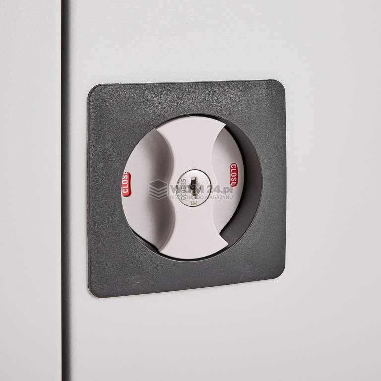Szafa z wpuszczoną, obrotową klamką oraz zamkiem trzypunktowym z dwoma kluczami, zapewniającym możliwość bezpiecznego przechowywania zawartości.