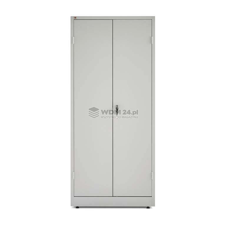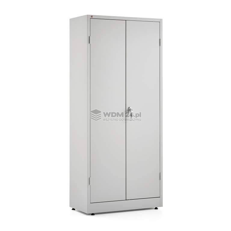 Zarówno korpus, jak i drzwi zostały pomalowane na dyskretny odcień szarości. W komplecie znajdują się regulowane stopki, umożliwiające wypoziomowanie szafy na nierównym podłożu. Produkt posiada pięć półek, z których jedna stanowi cokół. Pozostałe cztery półki regulowane w odstępach 50 mm, co pozwala stworzyć system przechowywania dostosowany do potrzeb. Każda półka wytrzymuje maksymalne równomierne obciążenie 50 kg. Dodatkowe półki dostępne jako akcesoria.