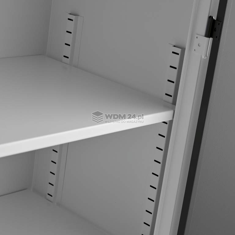 Szafę wyposażono w regulowane stopki umożliwiające wypoziomowanie na nierównym podłożu. Produkt posiada pięć półek, z których jedna stanowi cokół. Cztery półki z regulacją wysokości w odstępach co 50 mm umożliwiają łatwe przystosowanie szafy do potrzeb w zakresie przechowywania. Każda półka wytrzymuje maksymalne równomierne obciążenie 50 kg. Dodatkowe półki dostępne jako akcesoria.