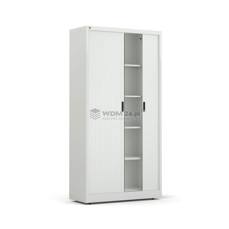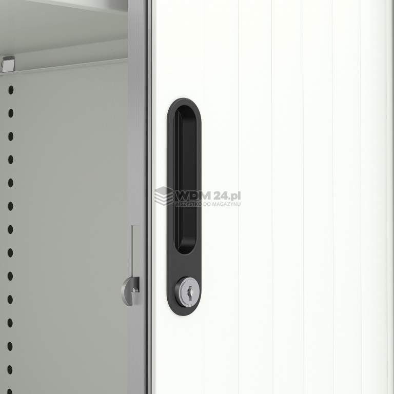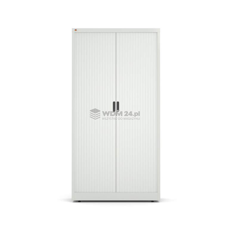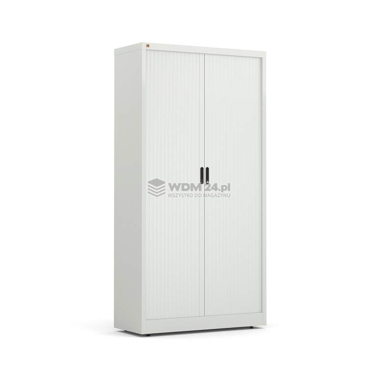 Oszczędzająca miejsce szafa z zamykanymi drzwiami żaluzjowymi. Posiada regulowane stopki (regulacja wewnątrz szafy). Uchwyty wpuszczone w drzwi. Szafa żaluzjowa to doskonały wybór do niewielkich pomieszczeń. Zajmuje niewiele miejsca. Oszczędzające miejsce drzwi zapewniają wygodę użytkowania i łatwy dostęp do przechowywanych przedmiotów.